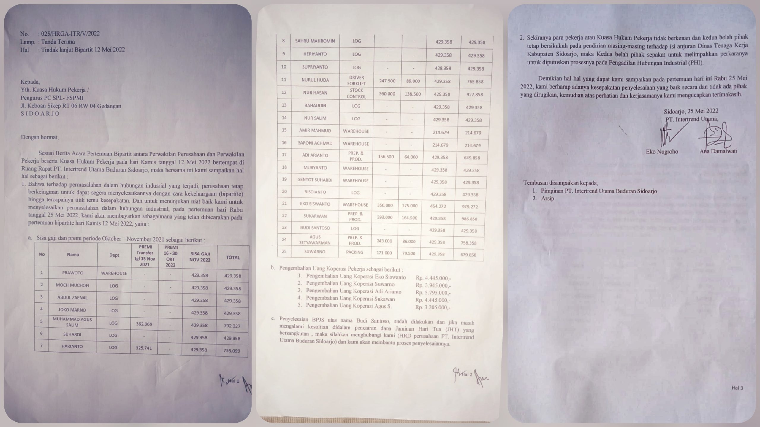 Dipimpin oleh Ketua PUK SPL FSPMI PT INTERTREND UTAMA ,Prawoto akhirnya mendatangi Perusahaan hasilnya adalah Perusahaan memberikan sisa gaji dan premi bulan Oktober- November 2021, Pengembalian Uang Koperasi dan Penyelesaian BPJS atas nama Budi Santoso.