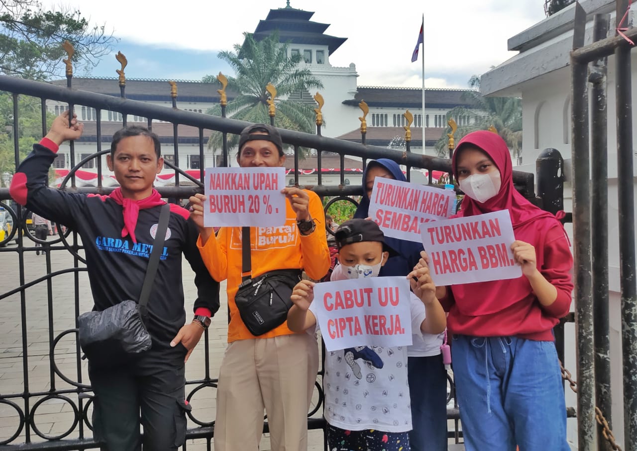 Bandung, KPonline – Dalam aksi unjuk rasa Aliansi Buruh Se Jawa Barat, Rabu (21/09/2022), di depan Gedung Sate, Provinsi Jawa Barat, terlihat hadir salah satu tokoh pergerakan dari FSPMI Henut Hendro Pramono.