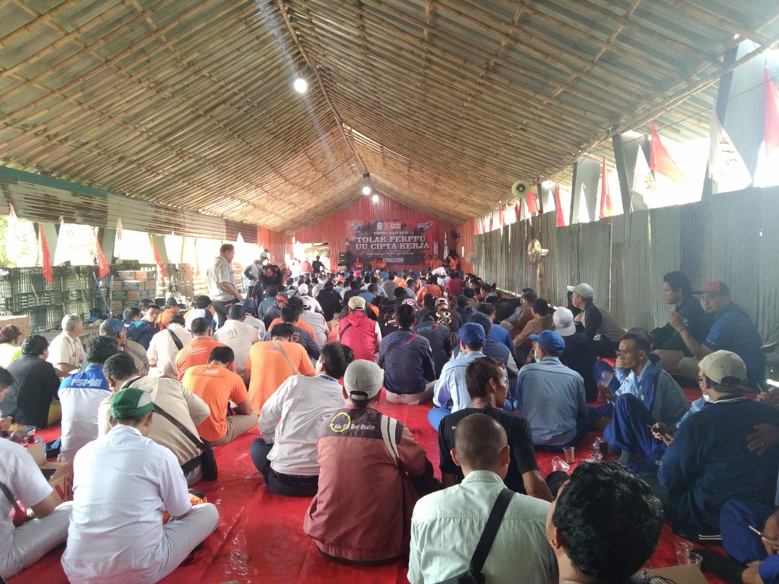 Bekasi, KPonline – Ribuan buruh Jawa Barat menghadiri konsolidasi aksi tolak Peraturan Pemerintah Pengganti Undang-undang (PERPPU) No.2 tahun 2022 tentang Cipta Kerja yang isinya tidak berpihak kepada kepentingan buruh.