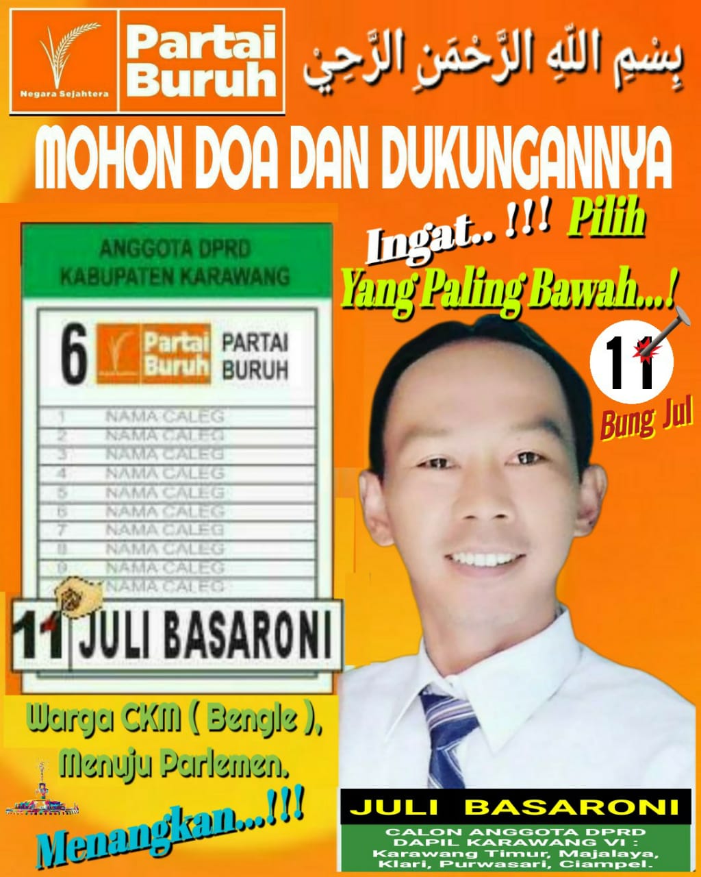 “Mohon do’a restu dan dukungannya, Saya Juli Basaroni akan maju dalam kontestasi politik Calon anggota legislatif DPRD kabupaten Karawang di Dapil 6 untuk terus bisa membangun dan mewujudkan kesejahteraan masyarakat khususnya di wilayah Kecamatan Majalaya, Karawang Timur, Klari dan sekitarnya.” pesannya di satu kesempatan kepada Crew Media Perdjoeangan.
