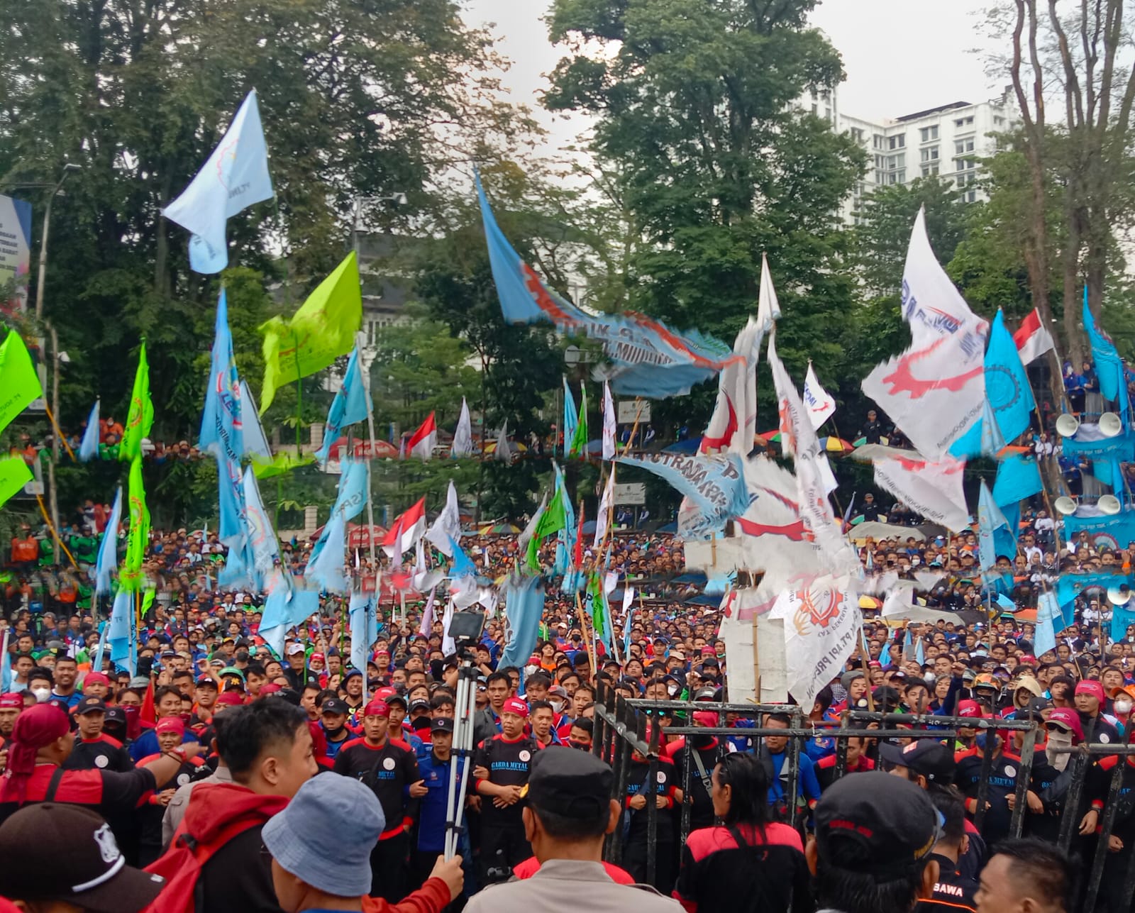 Bandung, KPonline – Ribuan massa aksi dari Buruh Jawa Barat hari ini Rabu 21 September 2022 gruduk kantor Gubernur Jawa barat dalam rangka menuntut legislatif Jawa barat agar membuat surat rekomendasi menolak kenaikan harga BBM, meminta kenaikan UMP Jawa Barat tahun 2023 sebesar 13% – 20%. Aksi tersebut diikuti oleh ratusan massa dari perwakilan PUK, PC dan KC FSPMI Kabupaten di Jawa Barat.