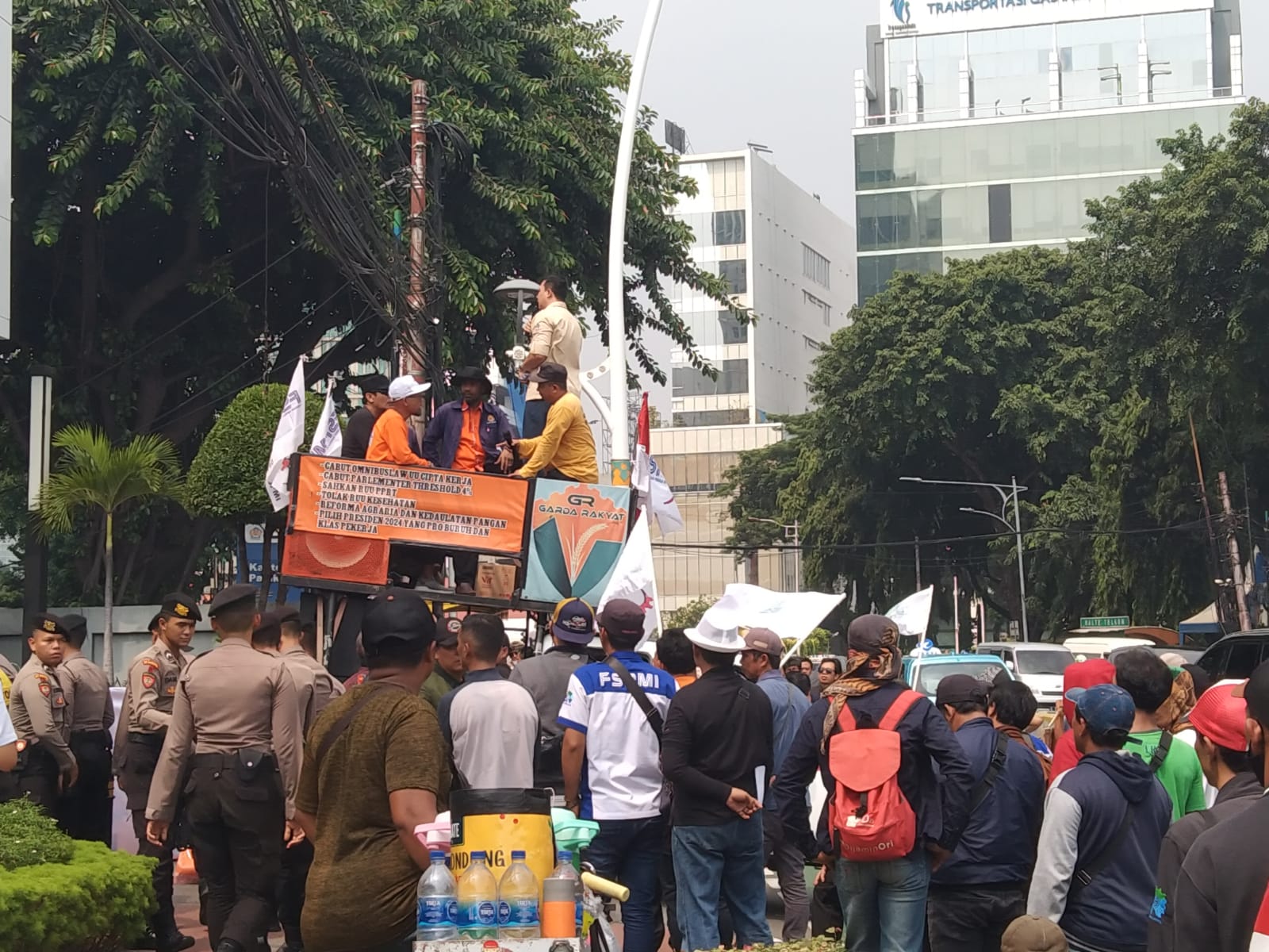 Jakarta, KPonline – Ratusan Buruh yang tergabung dalam Federasi Serikat Pekerja Metal Indonesia (FSPMI) pada Senin, 5 Juni 2023 melakukan aksi unjuk rasa di depan kantor Kementrian Perdagangan Republik Indonesia yang beralamat di Jl. M. Ridwan Rais No. 5, Gambir, Jakarta Pusat.