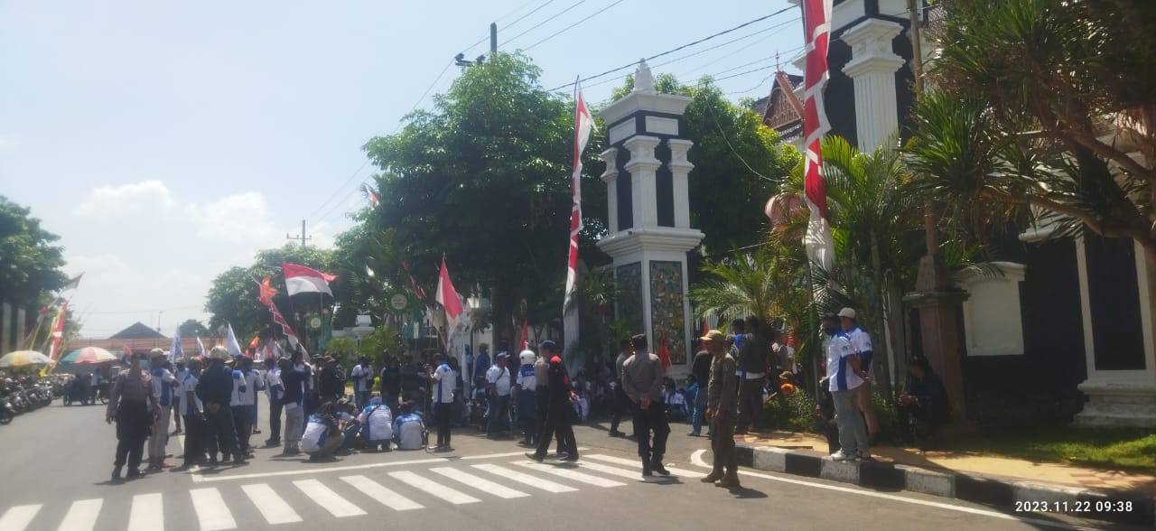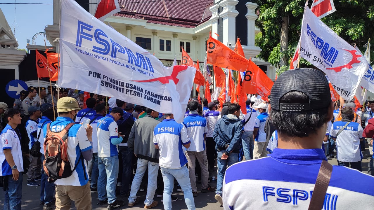Tuban, KPonline – Federasi Serikat Pekerja Metal Indonesia (FSPMI) menggeruduk Kantor Pemerintah Kabupaten Tuban untuk menuntut kenaikan upah minimum Kabupaten Tuban tahun 2024 sebesar 15 persen, Rabu (22/11/2023).
