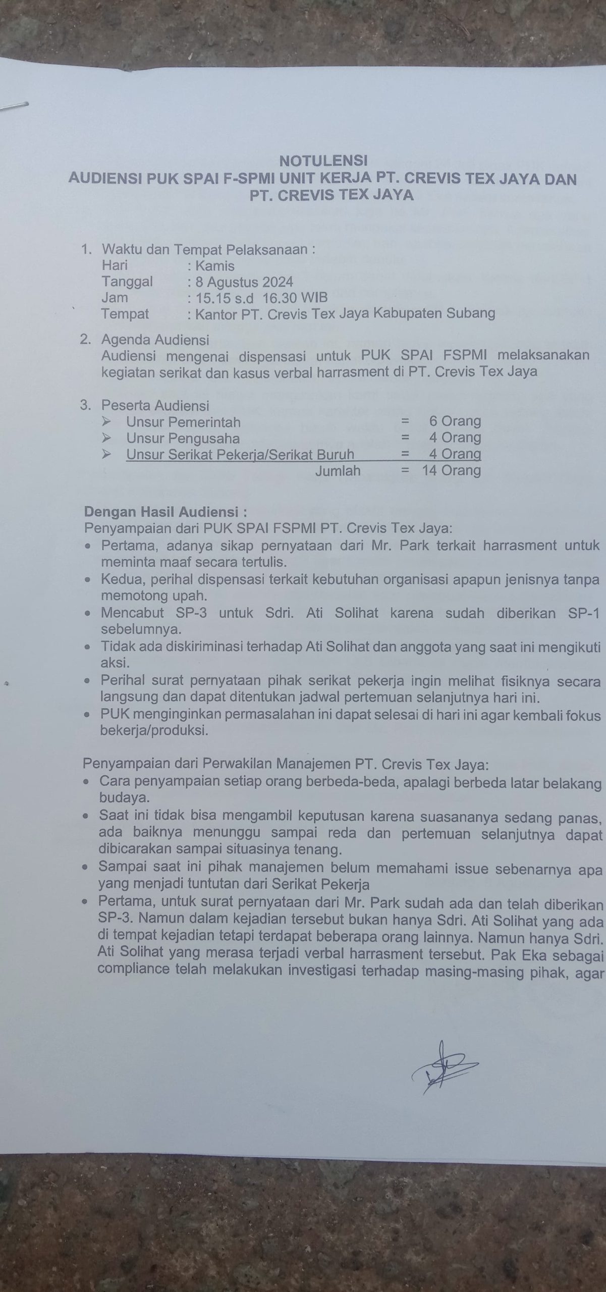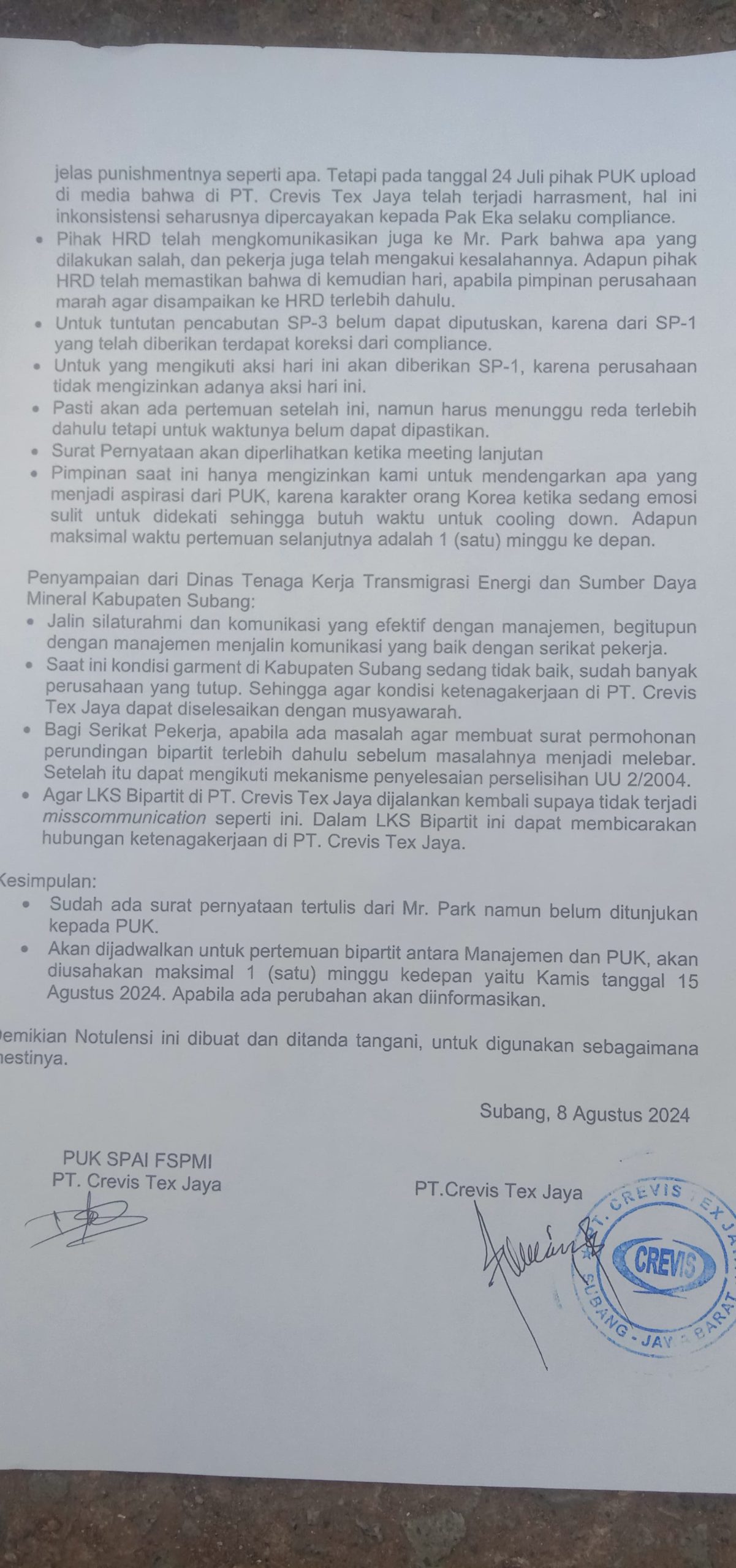 Seperti tertuang di salinan notulen yang di terima tim KPonline terkait SP, bahwa perusahaan akan memberikan sanksi SP 1 juga terhadap pekerja yang mengikuti aksi unjuk rasa menolak harrasment atau Workplace Bullying di PT Crevis Tex Jaya hari ini dengan alasan karena perusahaan tidak menginginkan adanya aksi, tertulis juga di notulen dikarenakan orang korea sedang emosi butuh waktu untuk colling down, perwakilan dari perusahaan menyampaikan meminta pertemuan lanjutan adapun waktunya minimal satu minggu, berbarengan membahas Surat pernyataan dari oknum WNA yang akan diperlihatkan. Adapun Disnaker Subang dalam notulen tersebut menyarankan salah satunya adalah agar LKS bipartit di PT Crevis Texj Jaya kembali di jalankan