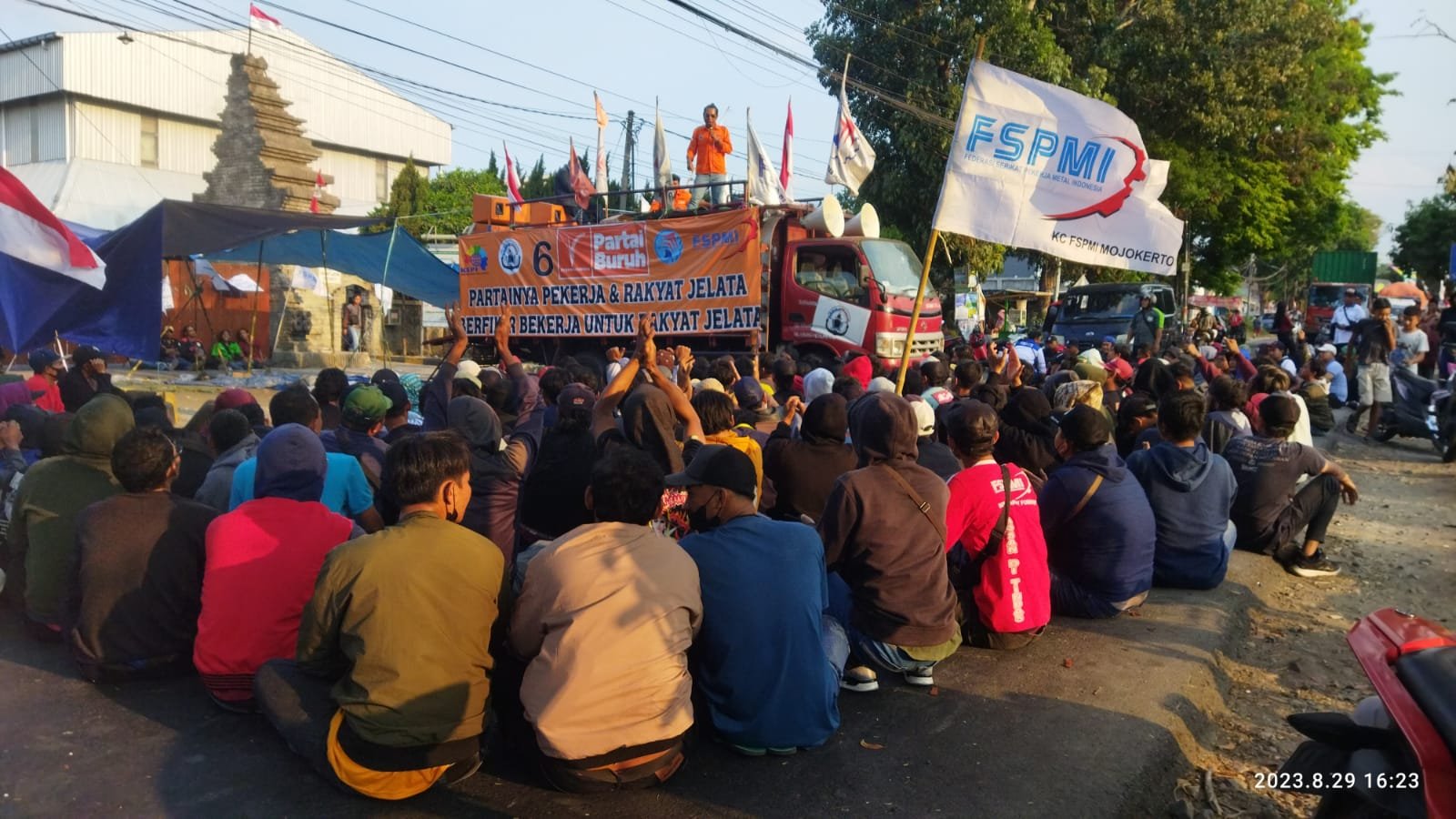 Mojokerto KPonline,Selasa 29-08-2023 pukul 15.30 WIB , FSPMI masih melakukan aksi unjuk rasa didepan PT. Prada Karya Perkasa Jl. Raya Mojosari-Pacet KM. 6,5 No. 88 Sugihwaras,Sampangagung, Kutorejo, Mojokerto.