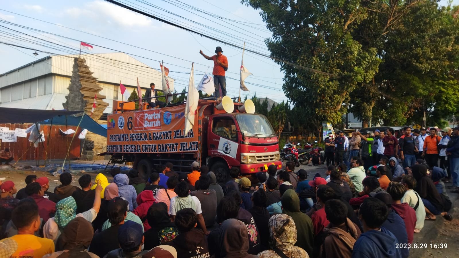 Orasi demi orasi terus diteriakkan melalui sebuah mobil Komando berwarna orange bertuliskan Partai Buruh.