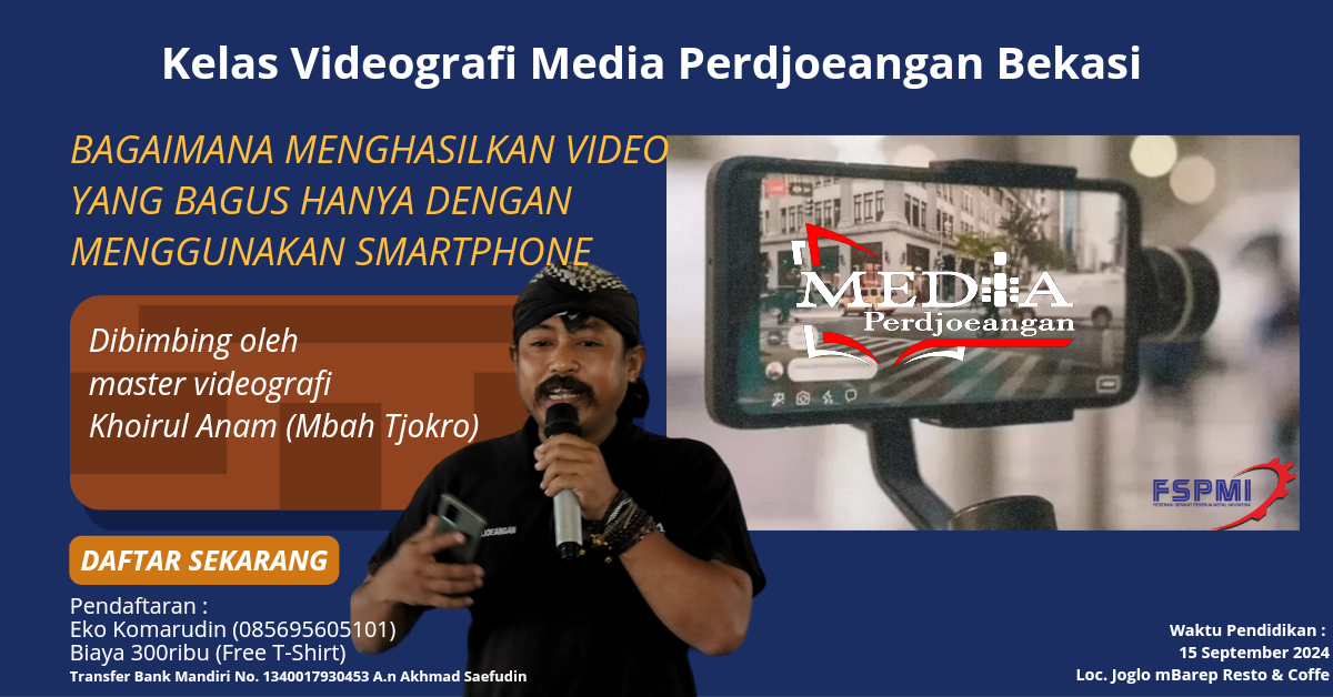 Bekasi, KPonline – Dunia multimedia terutama fotografi dan videografi saat ini banyak diminati. Bahkan tidak sedikit yang menggeluti profesi fotografer maupun videografer. Untuk itu, pengurus media perdjoeangan FSPMI Bekasi berencana menggelar kelas videografi pada 15 September 2024 dengan pengajar master videografer handal Khoirul Anam (Mbah Tjokro) dari Jawa Timur.