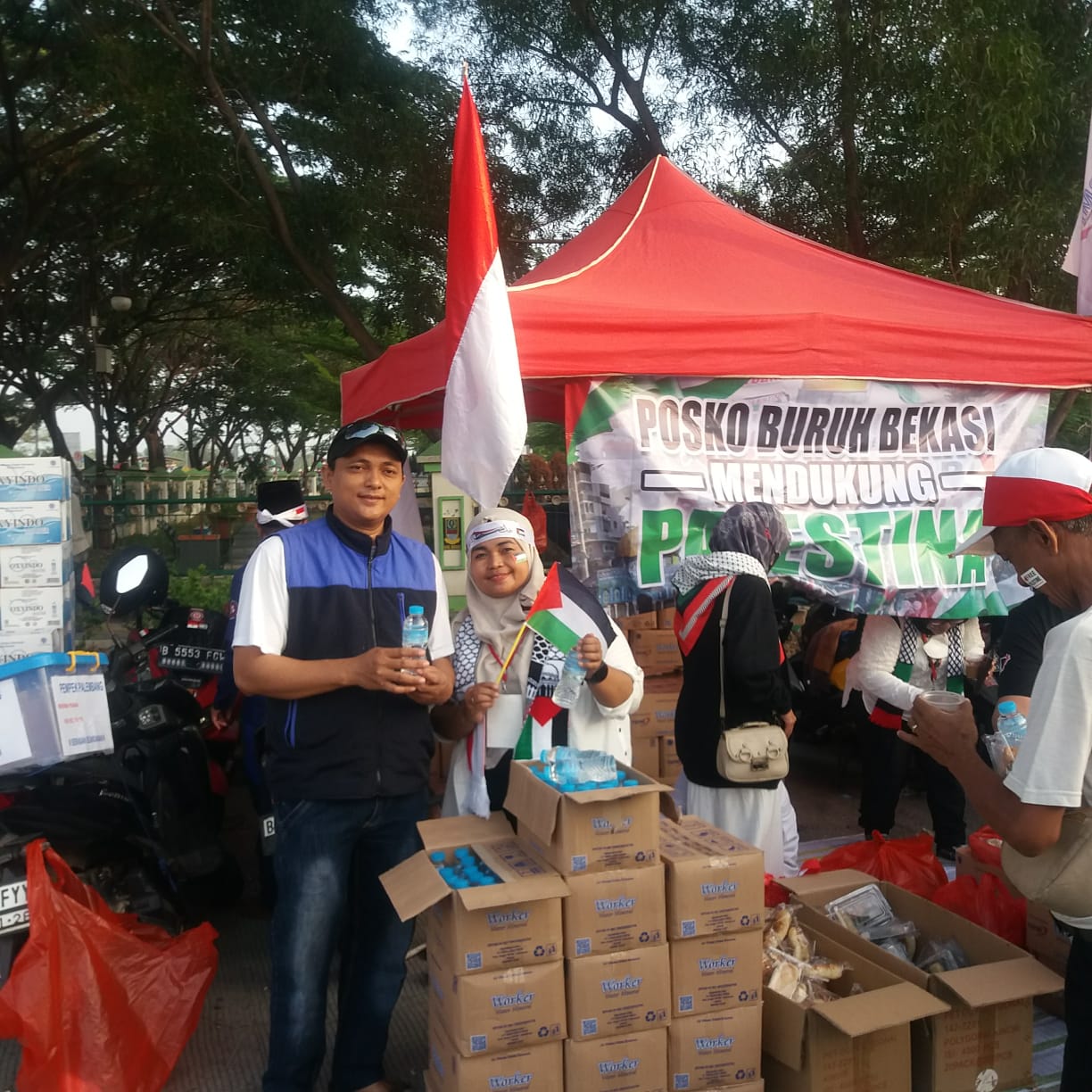 Dari pantauan Koran Perdjoeangan, Nur Cahyo menyampaikan melalui media WhatsApp di saat membagikan Worker Water Mineral di Posko Buruh Bekasi secara gratis kepada massa aksi damai bela Palestina.