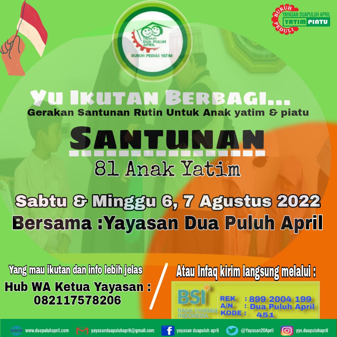 Bogor,KPonline – 7 Agustus 2022 Gerakan Santunan Rutin untuk yatim dan piatu yang dilakukan oleh yayasan dua puluh April dari tgl 6 dan 7 Agustus 2022 dilakukan diberbagai wilayah Bogor.